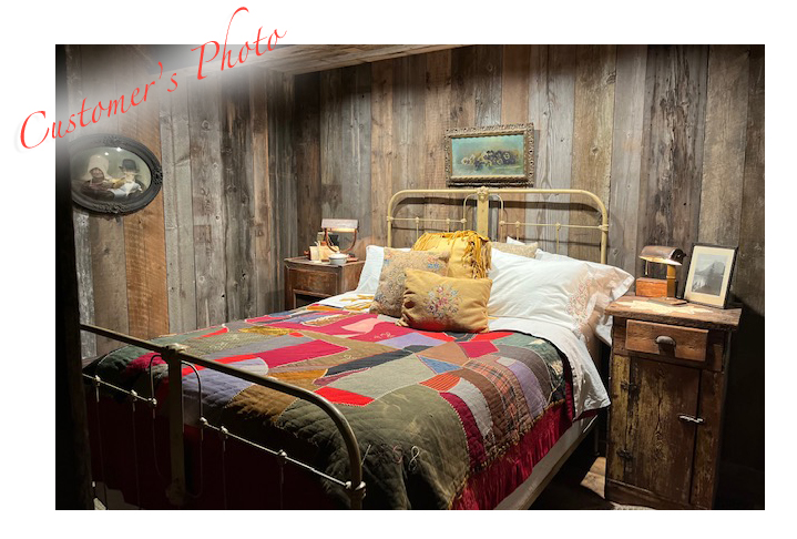 "I totally forgot to send you a picture of "The Thurston" custom bed you guys made for us. The little log cabin is complete!! We love the bed, and it looks just like it would have way back when!!! Also found a crazy quilt made in 1908 for it...how perfect!! Thanks again for all your help in getting it made for us and PS...Thurston our 25 lbs cat spends a lot ot time on the bed "just for him!!"